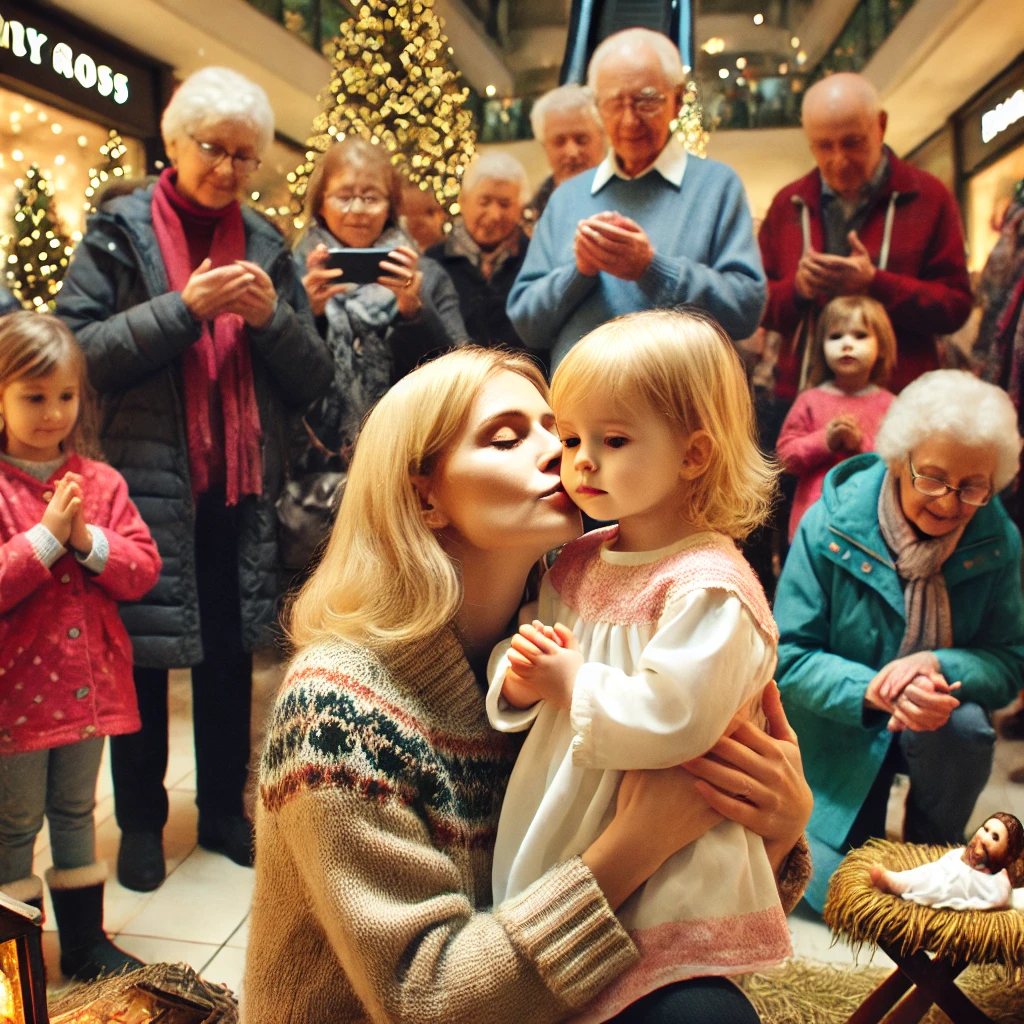“妳快把那個東西放下來,不要弄壞了!”尋聲望去,只見一個金髮大眼,約五六歲的女孩,拿著馬槽中的嬰兒耶穌,正在親吻。孩子的母親急匆匆地跑過去,奪走小女孩手中的嬰兒耶穌,將他放回小馬槽裏,蹲下來,流淚對小女孩說:“親愛的寶貝,很抱歉!媽咪今年沒有錢給妳買禮物,等明年媽媽有錢再買 ⋯⋯。”滿臉委屈,但女孩一手摟著媽媽,一手替媽媽擦眼淚,說:“媽咪,不要哭!嬰孩耶穌很可愛,但我不該隨便拿,我不要了。主日學老師告訴我們,耶穌活在我們心裏 ⋯⋯”。